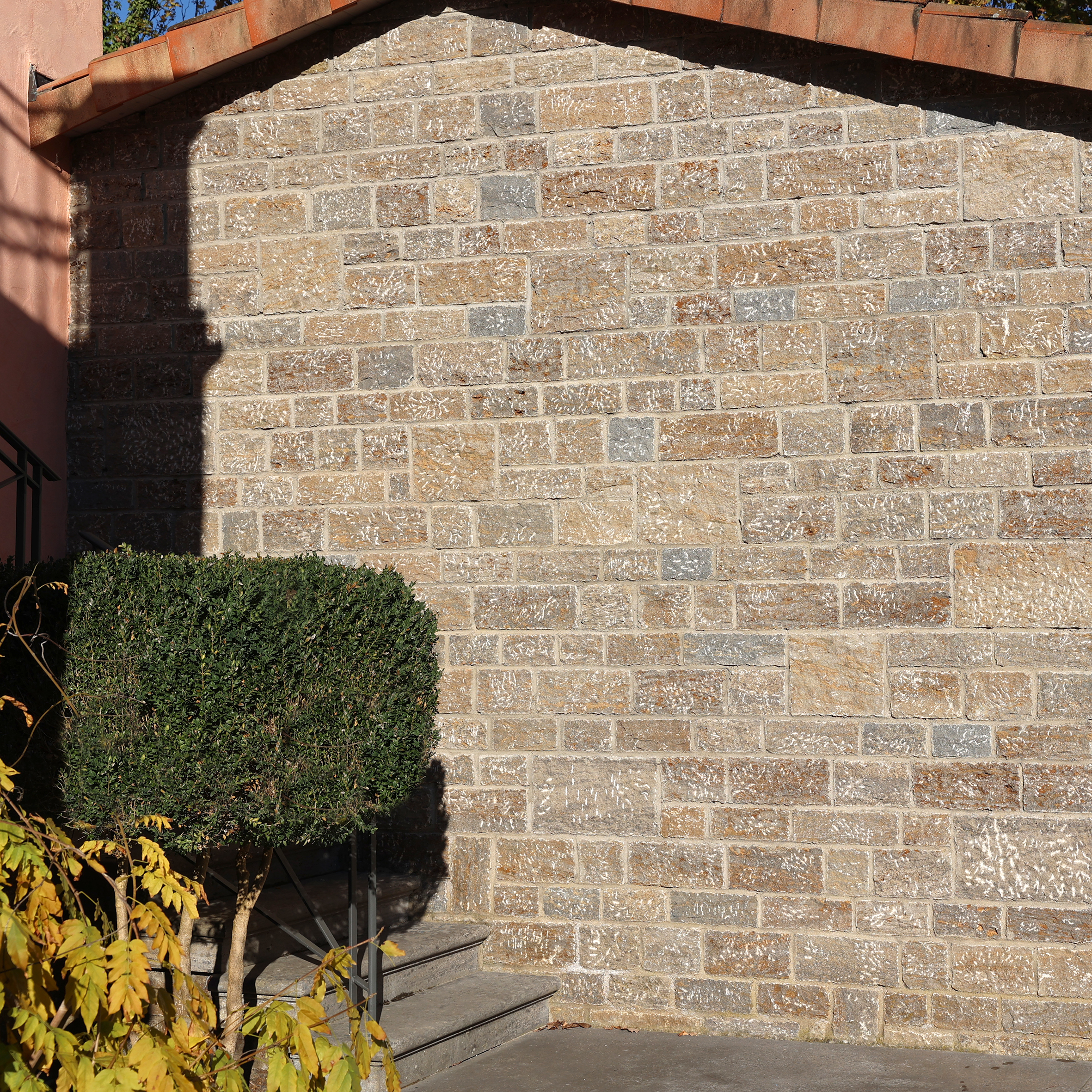 Unser Systemmauerwerk ist eine besondere Art von Mauersteinen und deren Versetzungsmuster. Bei den Systemmauersteinen ist die Vorder- und Rückseite gespalten. Die Lagerfugen sind gesägt. Die Stoßfugen teilweise gesägt bzw. gespalten.
